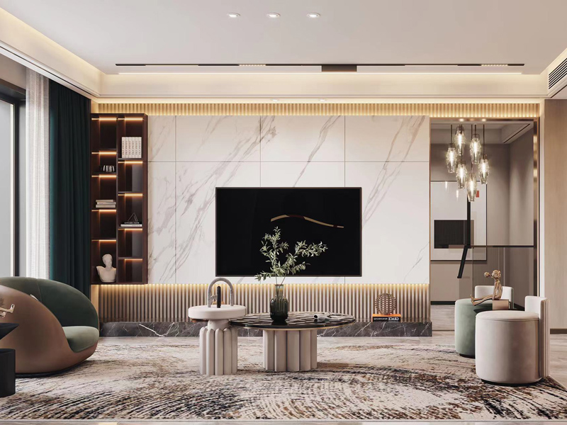 客厅背景墙采用大理石与格栅设计,通过材质碰撞营造出丰富的层次感,利用灯带提升氛围,更显温馨。