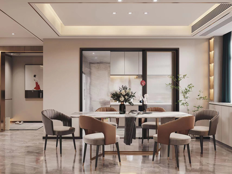餐厅区域采用开放式布局在厨房外侧,餐边柜设计增加就餐区域的杂物收纳功能,使就餐环境简洁干净。