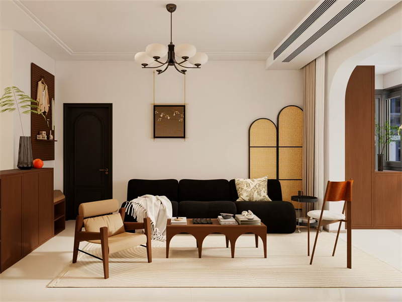 客厅以暖棕、米白与黑色为主色调,和谐又有层次感。木质柜体与藤编屏风注入自然肌理,带来独特美感,还挂有装饰画增添艺术氛围。整体呈现温馨且具格调,很适合放松休闲。