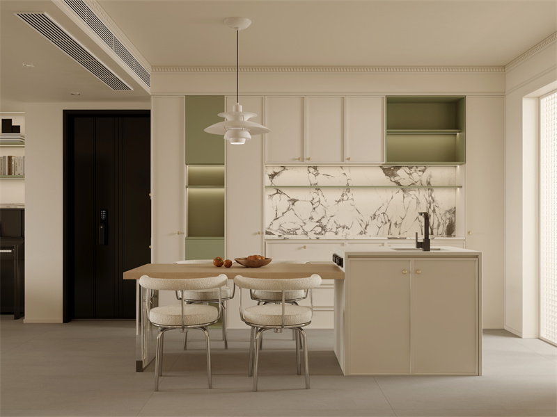 以奶油系为基底融合轻法式与现代风,白色柜体搭配莫兰迪绿嵌柜,大理石背景墙提升质感。木质餐桌与金属餐椅形成材质对比,营造出兼具精致与设计感的餐区。