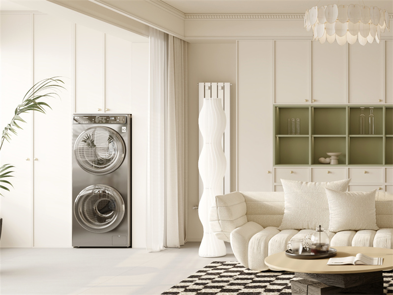 异形沙发与黑白格地毯形成视觉焦点。艺术吊灯与白色落地灯增添氛围感,洗衣区嵌入式设计提升空间利用率,绿植点缀增添自然气息,整体在风格统一中实现功能与美学的平衡。