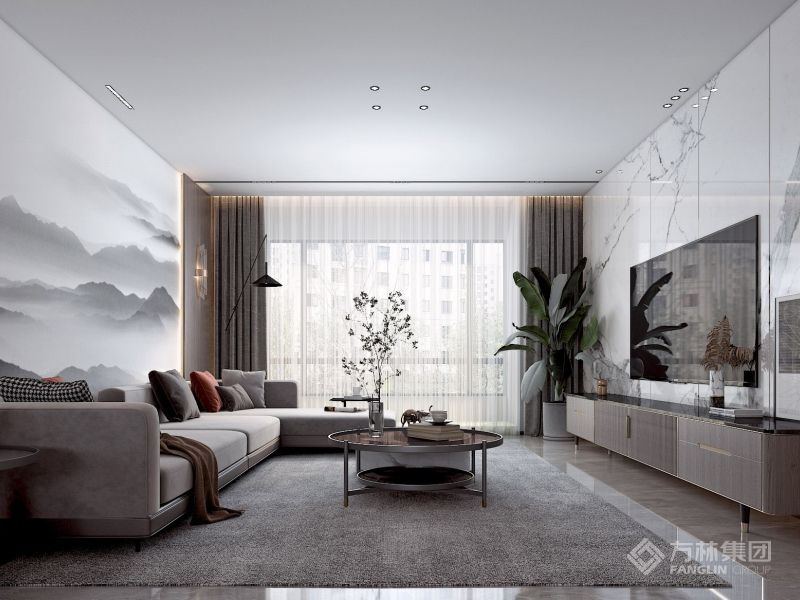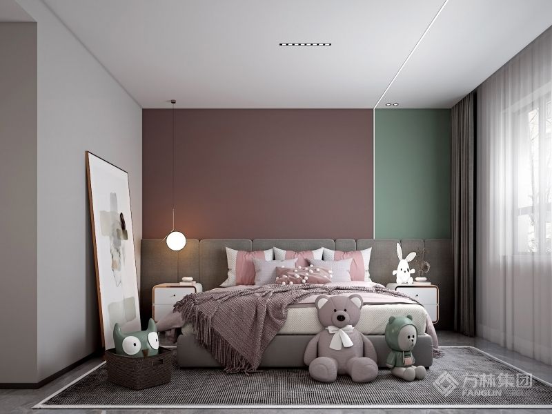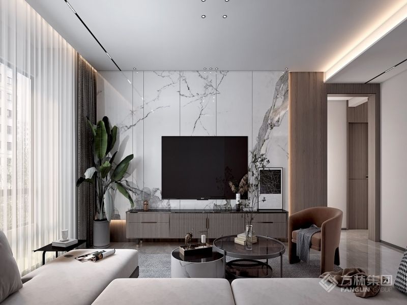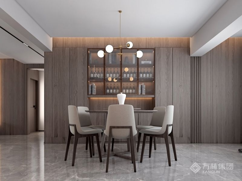 本案的效果比较保守,没有太前卫,也没有很普通,天花也是做了当下流行的无主灯设计,墙面用了全屋壁布,背景墙采用护墙板和大板瓷砖,还是比较中规中矩的感觉。