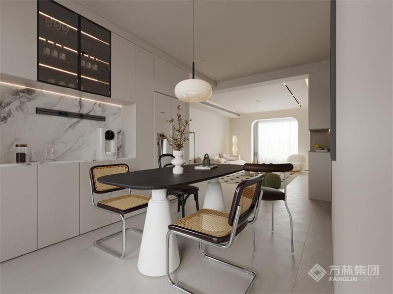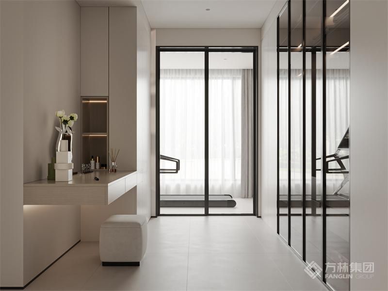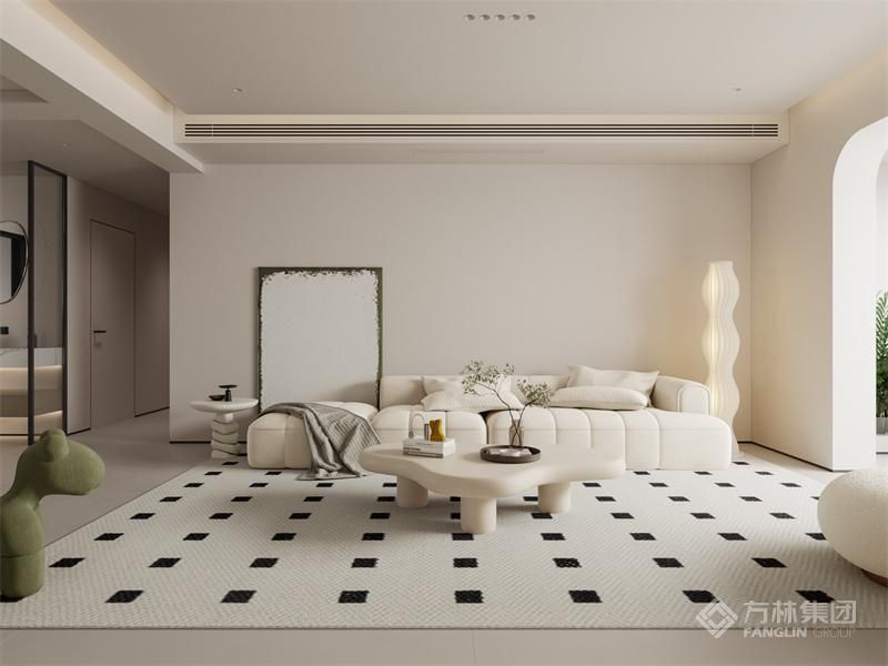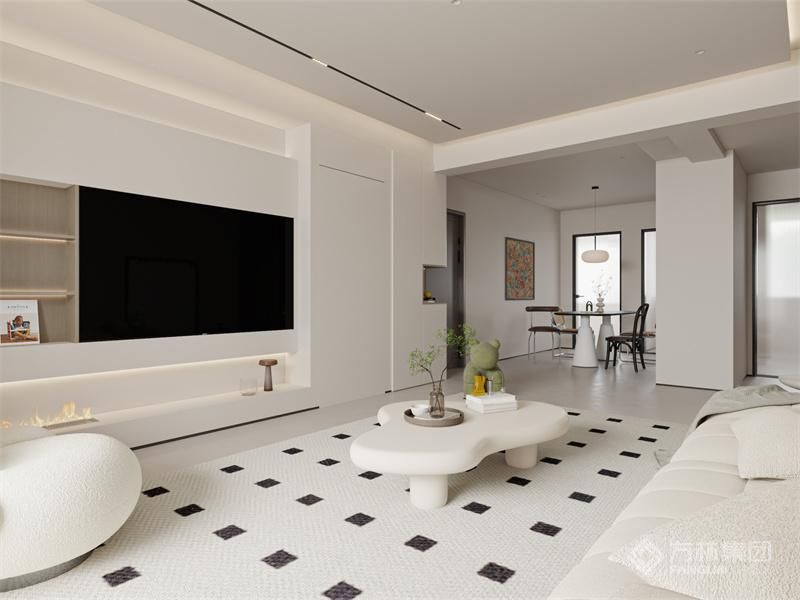 客厅色调温馨,次卧门采用隐形门的方式,提升电视墙的长度视觉感受,