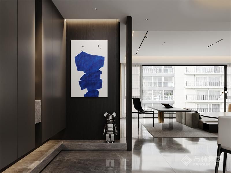 • 客厅主要采用高级灰、黑胡桃色作为主基调,营造出简约而优雅的氛围。同时,运用岩板的纹理及金属色进行点缀,提升空间的质感和档次。