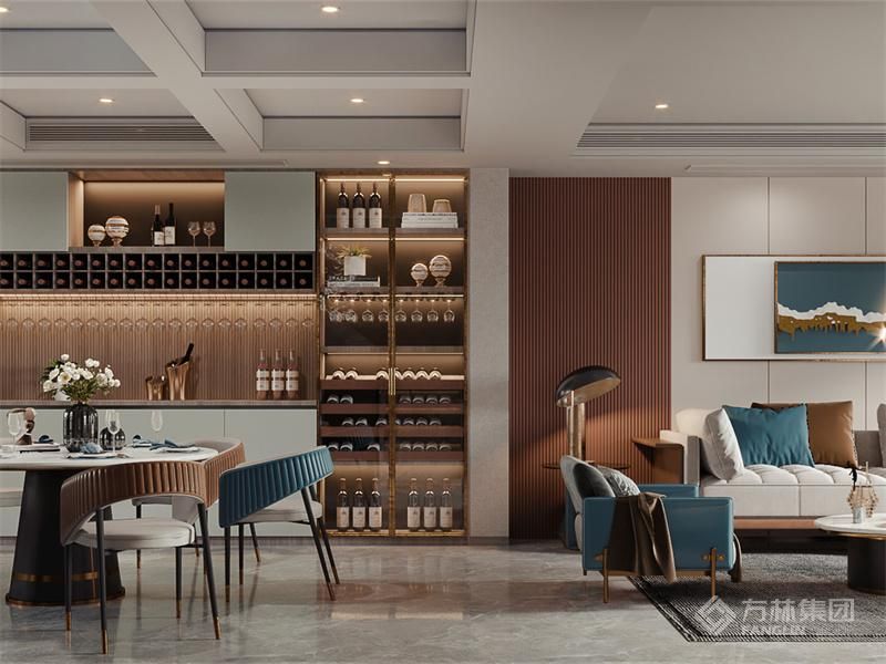 在硬装上面采用木饰面和抽缝的设计,墙板低调内涵,黑色点缀营造高级感。添加灯带元素让本身沉闷的空间尽显光泽。奶咖色与高级灰相结合透射出人文艺术的温度