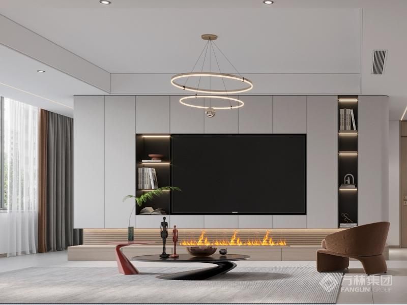 客厅整体边吊,电视背景墙采用了柜体来做,储物空间拉满。沙发墙用到了岩板和墙板的结合。整体色调明快。
