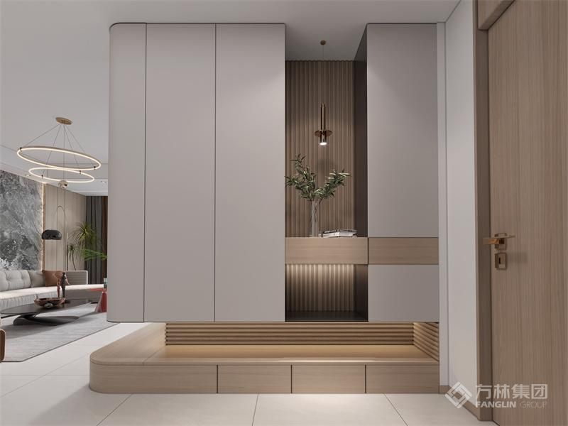 常住人口是主人、老人和小孩。所以整体是温馨明快的感觉。考虑到整体的房高,没有做无主灯的设计,但加入了一些氛围灯的设计。一进门的玄关墙砸掉了,跟电视柜结合,做了弧边的处理,也起到了动线的引导。入户玄关既起到了装饰的作用,也有储物空间的利用。