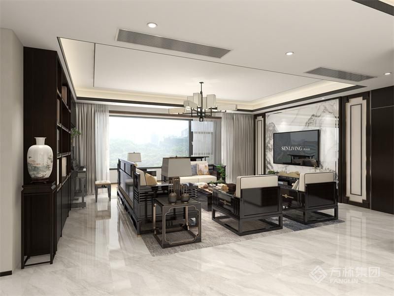 本户型是个大平层,后期三代同堂,还有两个小孩。整体是新中式的风格。不同于其他业主喜欢暖色,这个业主喜欢深色的木饰面以及冷色系。整体的话,我们地面会用一些浅色系的砖,与深色的柜子形成反差。在硬装造型方面,也会尽量简单,真正实现了轻装修重装饰。