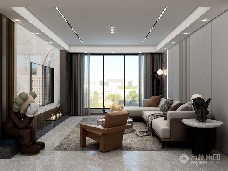 • 客厅空间以灰色为主基调,统一中又富有变化,顶部无主灯设计,白色的吊顶贯通南北,简约大气。或白或灰的色调,让客厅显得既沉稳也不失时尚,极简的搭配,塑造优雅的同时又具有现代设计感。