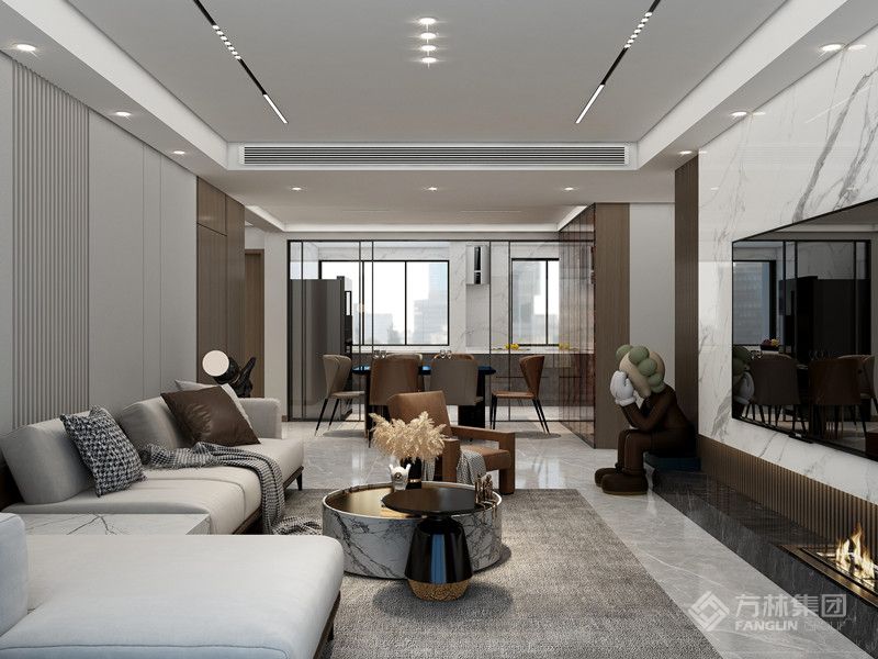 客厅空间以灰色为主基调,统一中又富有变化,顶部无主灯设计,白色的吊顶贯通南北,简约大气。或白或灰的色调,让客厅显得既沉稳也不失时尚,极简的搭配,塑造优雅的同时又具有现代设计感。